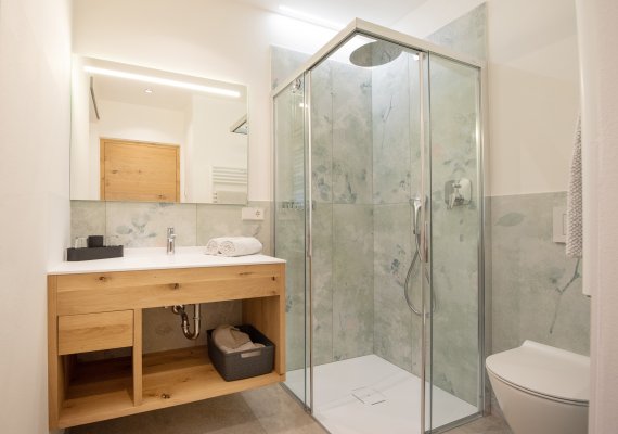 Dieses Appartement verfügt über zwei Schlafzimmer mit Doppelbett und angrenzendem privaten Badezimmer samt Dusche, WC, Bidet und Waschbecken. Die geräumige, voll ausgestattete Küche mit Ess-Ecke führt direkt auf einen großen Balkon mit Sitzgelegenheit und toller Aussicht auf das Rittner Horn, die Seiser Alm und den Schlern, den Latemar, das Weiß- und Schwarzhorn, die Belluneser Dolomiten sowie auf das Mendelgebirge mit dem Penegal und dem Gantkofel.